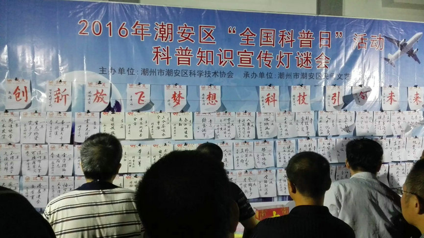 9月24日晚,由潮州市潮安区科协主办的2016年潮安区“全国科普日”活动——科普知识宣传灯谜会暨“互联网+”科普宣传在潮安人民公园举行。本次活动围绕“创新放飞梦想 科技引领未来”的主题,以“普及传播发展理念,倡导创新创造创业,促进公众理解高新科技,倡导科学生活方式”为主要内容,为广大公众送上一场形式多样、内容丰富、体验实践和寓教于乐的“科普大餐”。