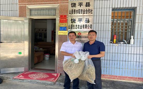 市农科中心科技人员将今年早造提纯的“三饶香稻”种质送给当地合作社