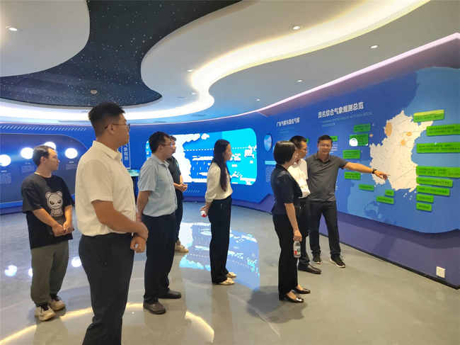 调研组一行听取科普教育基地负责同志对基地的建设情况汇报,参观了茂名市气象科普馆、360°环幕影厅、气象科普报告厅、气象展播厅、气象观测仪器展示室等科普设施,了解基地日常运作以及针对不同群体开展的气象科普活动的情况。