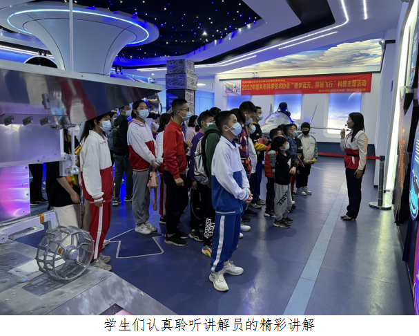 第二个环节是在科普讲解员的带领下参观航天航空展厅,科普讲解员将我国航天事业发展史娓娓道来,学生们在认真聆听,讲解过程中科普讲解员积极和学生们进行互动。科普讲解员对“玉兔二号”、“天宫一号”等航天航空模型进行深入讲解,让学生们更真切的感受到我国航天事业发展从无到有、从有到强的显著变化,学生们对此感触很深。在讲解完毕后,学生们在科普志愿者的引导下有序的进行航天航空VR沉浸式体验,通过头戴式的VR设备,切身体验到“重返地球”、“登月”、“飞越中国”等一系列的VR项目,学生们反响热烈,纷纷表示获益良多。