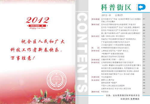 2012年春节前夕,汕头市澄海区科协紧紧把握节日科普的有利时机,以群众的节日科普诉求为切入点,精心策划制作,编印并推出新一期《科普街区》(2012年——“春季”)。