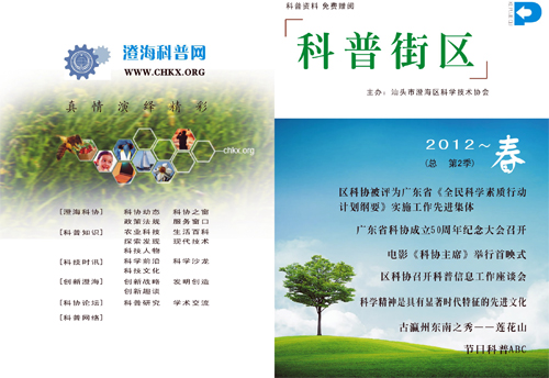 为深入贯彻落实十七届六中全会、中国科协八大、中国科协人才与调宣工作会议以及纪念广东省科协成立50周年大会精神,澄海区科协继续加大科普资源的开发力度,在借助信息网络技术完善《澄海科普网》整体建设和总结前期制作各类科普宣传物经验的基础上,按照“科学性、大众性、实用性、时效性、共享性”的原则,借鉴杂志办刊的模式,高标准严要求,以图文并茂和时尚简约的形式,尝试设计制作准杂志的综合性科普季刊——《科普街区》。