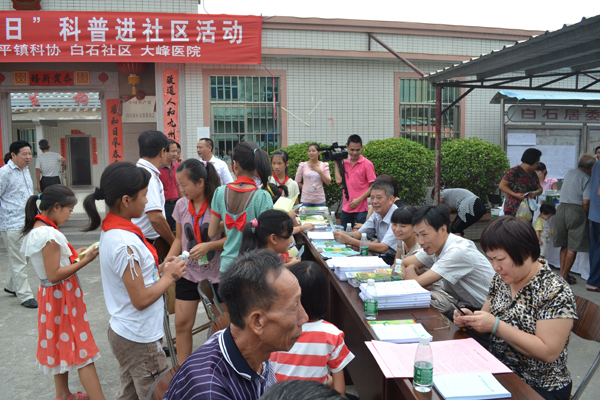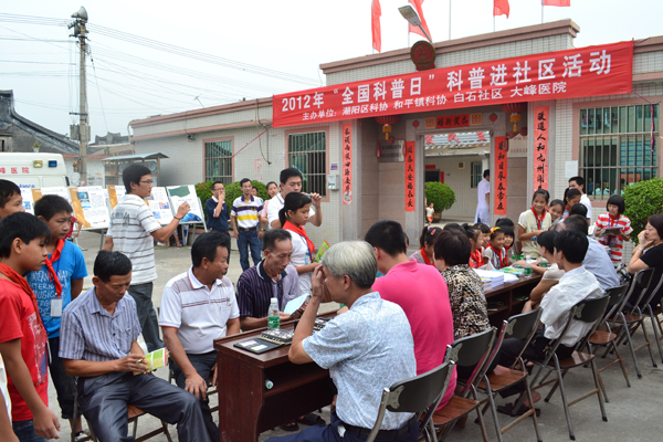 9月18日,汕头市潮阳区科协联合和平镇科协、和平镇白石社区、大峰医院,围绕“节约能源资源,保护生态环境,保障安全健康,促进创新创造”的活动主题,在区科普示范社区——和平镇白石社区举办潮阳区2012年“全国科普日”科普进社区活动。主办单位和区农学会、区海洋与渔业学会的科技(普)工作者、医务工作者20多人参加了活动。