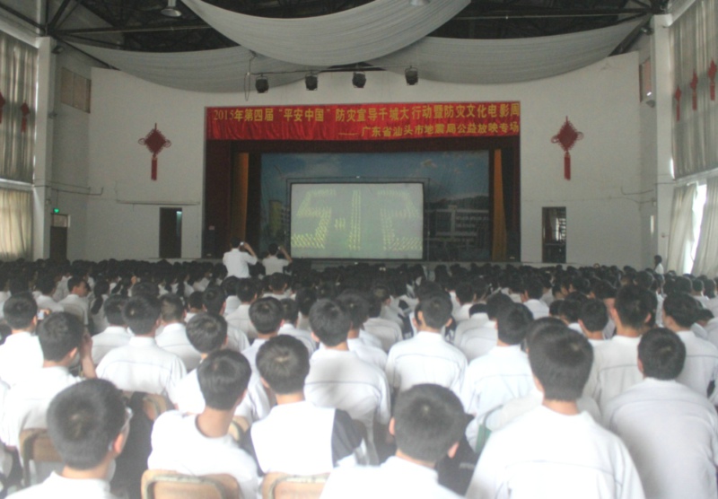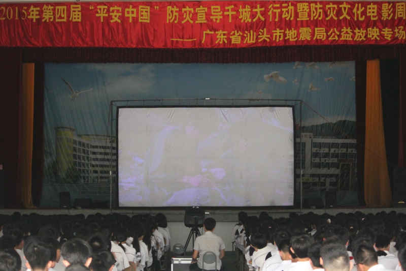 为进一步提高汕头市濠江区中学生防震减灾意识和应急自救、互救能力,切实增强中学生的安全保护意识,5月8日下午,在汕头市地震局的大力支持和指导下,濠江区科协、区经信局在达濠华侨中学大礼堂举行“2015年第四届‘平安中国’防灾宣导千城大行动暨防灾电影放映周”专项活动。汕头市地震局吴华强纪检组长、张惠霞科长和区经信局郑伯香副局长等领导莅临活动现场进行指导。达濠华侨中学高一级师生共900多人参加了活动。