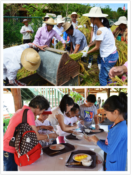 农田里,家长和孩子都戴上手套和草帽,穿上雨鞋,左手握镰刀,右手拽水稻,在农民伯伯的指导下,不一会儿就收获了一大片金灿灿的水稻,接着将割好的水稻搬到打谷机前打谷,将谷粒装袋,学习捆扎稻草,还利用稻草、竹竿编织了各种生动可爱的的稻草人,体验了大自然的奇妙乐趣。在用水稻产出的白米饭自制饭团的环节中,孩子们发挥了创意的想象,将平凡的白米饭变成形状各异的美味饭团,和父母一起品尝幸福的味道。活动不仅让小朋友们增强了动手能力,懂得了爱惜粮食的意义,更增进了亲子之间的情感,受到家庭的热烈欢迎,取得圆满成功。