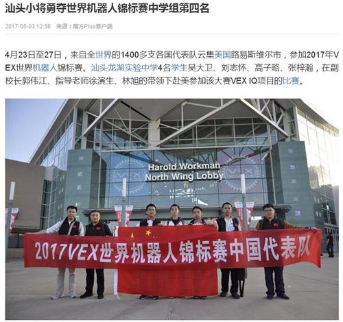汕头龙湖实验中学作为我省首个参加“2017 VEX世界机器人锦标赛”VEXIQ项目的代表队载誉归来