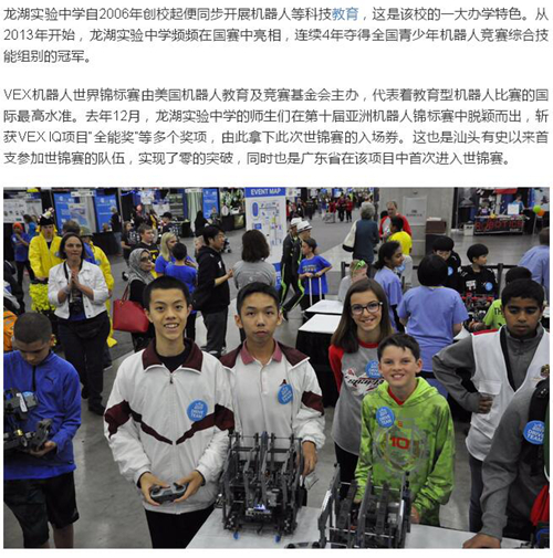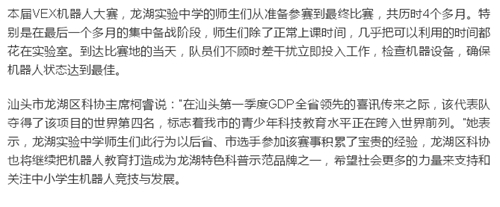 这是广东省在机器人VEXIQ项目上首次荣获参加世锦赛资格,也是我市首次参加世界级机器人竞技的最高赛事,得到社会热烈反响,汕头市民引以为傲,标志着汕头市、龙湖区的青少年科技特色教育水平正在迈向世界前列,科技和创新在龙湖区各个领域蔚然成风。该赛事得到省、市各有关媒体的广泛报道。下面截取有关新闻报道及相关资料,以作回顾。