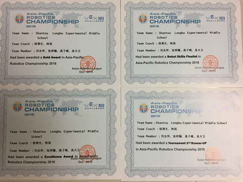 2016年第十届亚洲机器人锦标赛龙实代表队获得的荣誉证书