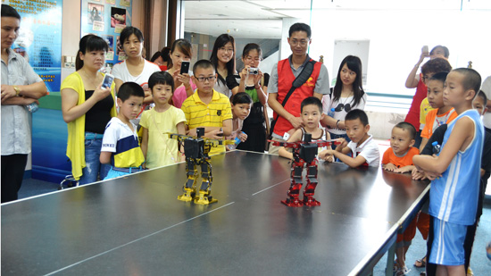 “机器人创新实践室”不仅可以让青少年学生了解智能机器人的各种运用原理,亲自动手装配制作智能机器人,还可以观看人型机器人随着音乐的节奏跳各种舞蹈及高难度动作。人型机器人是利用仿生学的原理,全身设计有17个关节,每个关节可以转动 200度,能做出上万种模仿人类的动作。青少年学生在和机器人互动性体验中,能够轻松地了解智能机器人的构成奥秘,激发青少年学生对机器人技术的兴趣,鼓励更多的青少年爱好者在机器人领域学习、探索、研究和实践。