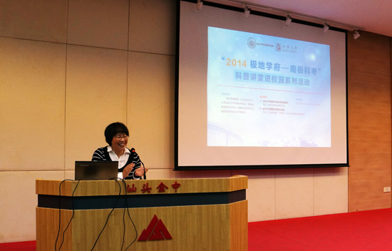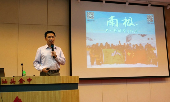 4月17日,作为纪念第45个世界地球日的主题活动,汕头市科学技术协会、汕头大学联合举办的“2014极地学府—南极科考”科普讲堂进校园系列活动在汕头市金山中学学术报告厅正式启动,首场活动由汕头大学南极科考队领队、汕头大学副校长、李丹博士做“南极——不一样的学习经历”的精彩演讲。