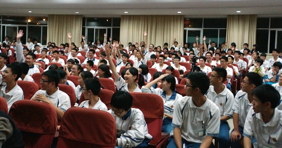 当晚,400多个座位的学术汇报厅座无虚席,李丹校长的演讲不时引起广大师生的赞叹声、惊叹声,掌声此起彼伏。在互动环节,金中师生争相提问,与2014汕大南极科考队的几位学生队员热烈互动,分享科考队的科考成果和艰辛历程,在不一样的学习课堂中体验惊心动魄的南极科考活动,分享科考队的丰硕科考成果,感受“一起走,走得更远”的团队互助精神。