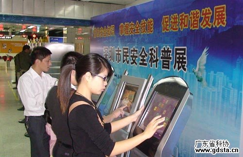本次活动以 “平安深圳,是我们共同的追求!”为主题。深圳市科学技术协会主办,深圳市安全生产科学技术学会、深圳市地质学会、深圳市营养学会联合承办。展示内容以公共安全知识为主,并包含部分的生产安全知识。共分为十一个不同的展区,其中有两个特色展区,一个是电视墙区,正在循环播放《公共安全知识》(动画VCD)、《城市紧急避险》(动画VCD)等科普节目。另一个是互动区,该区域放置三台触摸屏,很多市民排队参与到这项活动,笔者也排队等候加入到体验者的队伍,亲身体验这一互动式科普。原来里面分别装入“火灾逃生”、“灭火游戏”、“灭火器选择”、“安全标识连连看”、“家居安全隐患查找”、“英雄救美(紧急知识)”动画游戏。采取这种方式确实增强了科普活动的趣味性,大大提高了广大市民学习科普知识的主动性,将安全科普知识传达到市民的工作、生活中,达到了举办活动的目的。