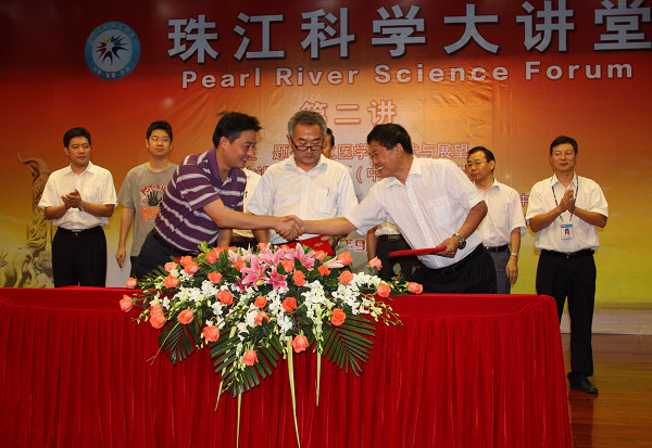 广东科学中心党委书记易和、广州市科技和信息化局党委副书记马曙、羊城晚报社社委孙璇分别代表三方主办单位共同签署《“珠江科学大讲堂”科学论坛合作协议》。中国工程院院士、中国工程院医药卫生学部主任杨胜利,中国工程院院士、南方医科大学临床解剖学研究所所长钟世镇,广州市科技和信息化局局长、党委书记谢学宁,广州市卫生局胡丙杰副局长,广东羊城晚报广告有限公司总经理胡泉,广东科学中心副主任江洪波,广东科学中心党委副书记朱才毅等领导出席活动并见证签约。