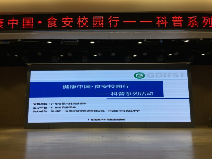 为提高中小学生对食品的了解,增强孩子健康饮食、安全饮食的意识和能力,今年,在广东省振兴科技基金会的支持下,广东省食品学会特组织策划了“健康中国•食安校园行”科普系列活动,分别在深圳市翠北实验小学、广州市天河区岑村小学、广州市天河区元岗小学先行开展。