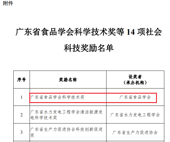 “广东省食品学会科学技术奖”获广东省科学技术奖评审委员会备案