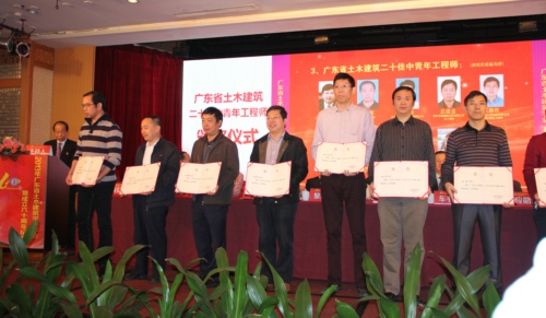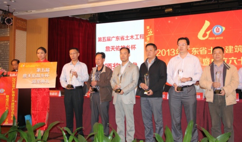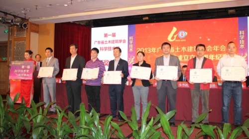 韩大建顾问宣读了广东省土木建筑学会科学技术奖名单,广东省土木建筑学会科学技术奖是2012年经广东省科学技术厅批准,由广东省土木建筑学会、广东省建筑工程集团有限公司、广州市建筑集团有限公司、广东省建筑科学研究院和广东建华管桩有限公司共同设立,今年评选了第一届,今后将每年评选一届。一等奖的获奖代表上台领取了奖状。