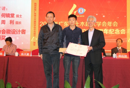王离副理事长兼秘书长介绍了学会会徽征集情况及主持了颁奖,会徽的确定是今年学会工作的一项重大成果,提升了学会的整体形象。邀请了何镜堂院士、五邑大学土木建筑学院周利院长为会徽设计者--五邑大学艺术设计学院环境艺术设计系室内设计专业一年级的学生叶锐权同学颁发荣誉证书和奖金。