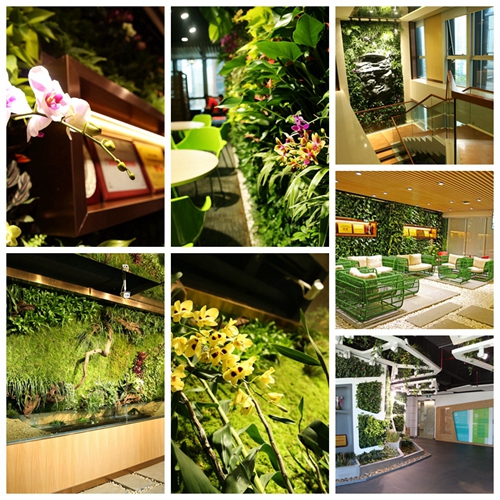 水培式绿墙整体采用流线型设计,采用枯木、凤梨、兰花、蕨类、苔藓等30多种原始植物与现代植物进行搭配,自然高度差形成了层次分明的立体效果,营造出一个微观的热带雨林。石头采用立体的玻璃钢雕塑,跌水采用了循环系统。使在城市中的办公人也享受阳光、雨露的滋润,聆听植物的诉说,繁忙中也能随时享受片刻的宁静、和谐。