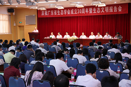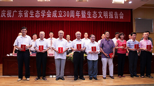 会上还对广东省生态学会30位老一辈生态专家、30名优秀生态科技工作者和20个生态文明建设示范单位进行了表彰奖励。此外,庆典大会还进行了学术报告,省生态学会理事长彭少麟、副理事长骆世明分别作了《华南生态秀山河》、《广东生态学30年发展概要与展望》的专题报告,介绍了广东生态学研究进展及生态建设成果。