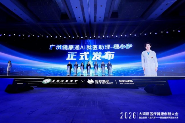 在广州市卫生健康委、蚂蚁健康和医疗卫生机构代表的共同见证下,大会现场正式发布了广州健康通AI就医助理“穗小伊”。