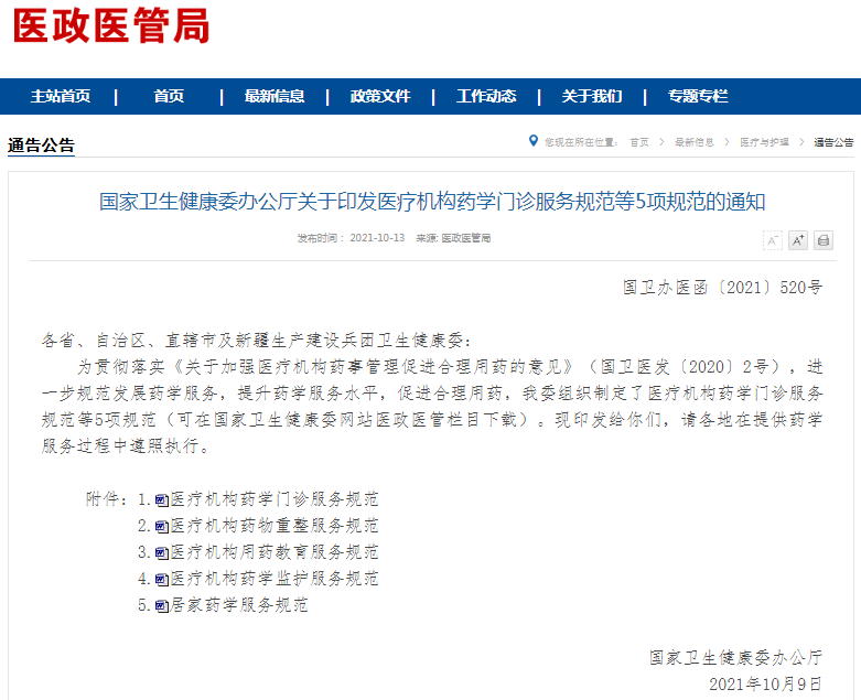 国家卫生健康委办公厅关于印发医疗机构药学门诊服务规范等5项规范的通知