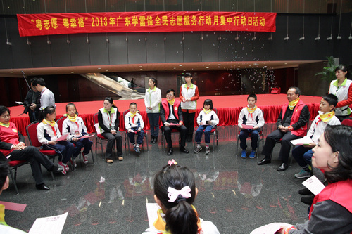 2013年3月5日,2013广东学雷锋全民志愿服务行动月集中行动日活动在广东省博物馆启动。省委常委、宣传部部长庹震,副省长林少春,中国工程院院士、省科普志愿者协会会长刘人怀等领导嘉宾与南粤志愿服务“红棉奖”获得者、明星志愿者、机关党团员志愿者、行业志愿者、大学生志愿者、社会志愿者等一同担任校外志愿辅导员,陪伴50名异地务工人员子女开展“朝阳行动”,上了一堂别开生面的素质拓展课和科普辅导课。