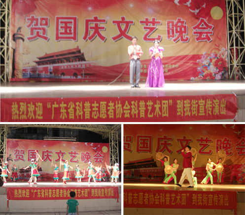 9月27日晚,载着科普人的全部热情和责任,艺术团来到了佛山市南海区平洲街道平西社区,与当地的干部群众共同举办“贺国庆科普文艺晚会”,演出各种科普文艺节目,共度科普日活动。晚会设在平西科普文化广场,只见舞台下挂着“热烈欢迎广东省科普志愿者协会科普艺术团到我街演出”的大红横额标语,现场更是人山人海,既有当地的父老乡亲,更多的是外来工兄弟。他们都说,难得省里来的宣传队伍与民同乐,而且节目内容与科普相结合,如“绿色环保”、“食品质量安全”、“垃圾分类”等,使人寓科普教育于艺术欣赏之中。