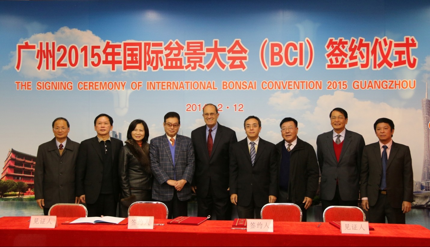 2014年2月12日,广州2015年国际盆景大会签约仪式在中山纪念堂举行。国际盆景协会主席汤姆斯夫妇、行政理事郑慧莹、名誉主席苏义吉,广州市政府副秘书长龚海杰,广州市林业和园林局副局长陈迅,广州市外办副主任王福春,广东园林学会理事长石安海、副理事长兼秘书长彭承宜、顾问吴劲章,国际盆景协会中国地区主席吴成发、秘书长黄就伟,广州盆景协会常务副会长兼秘书长谢荣耀等以及广州市法制办、林业和园林局的相关部门和单位的领导、代表出席了本次签约仪式。